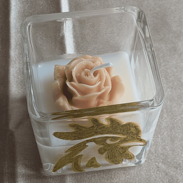 Verre gravé à la main, bougie artisanale composée de 30 g de cire d’olive et rose moulée et 10 g de cire de colza.