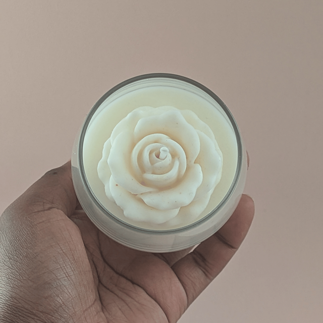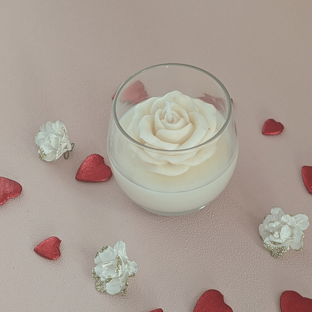 Cette petite bougie en forme de rose, coulée à la main, diffuse la senteur douce et enveloppante du musc blanc.